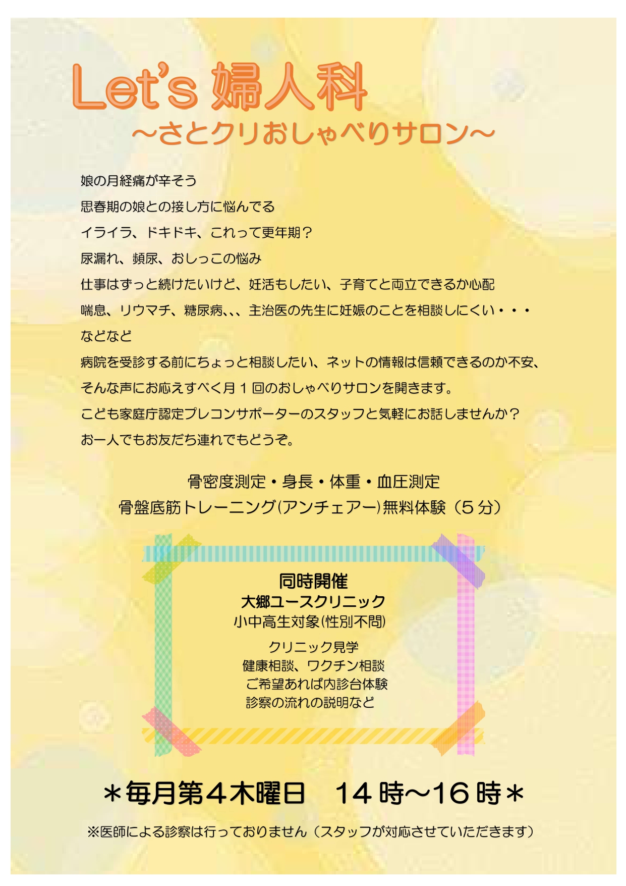 毎月第4木曜日 14時〜16時 さとこ女性クリニックにて開催しております (医師による診療はおこなっておりません)
